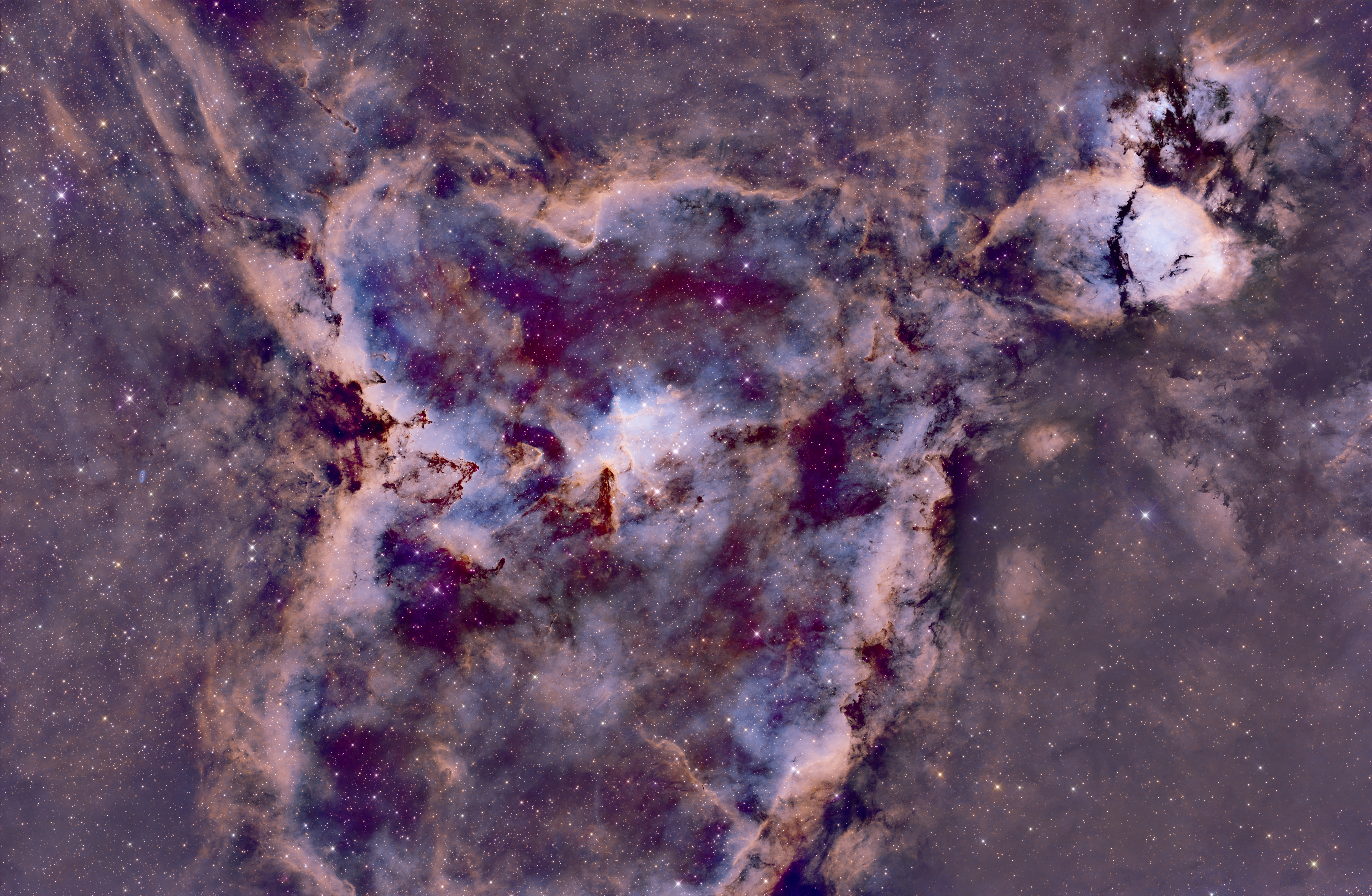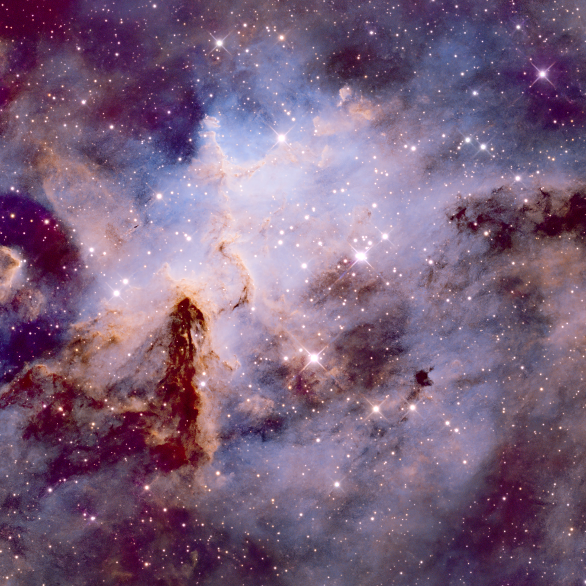 En el centro de la imagen destaca el cúmulo abierto Melotte 15. Este joven grupo de estrellas, de apenas 1,5 millones de años de edad, es el verdadero motor energético de la región. Sus estrellas masivas (algunas con 50 veces la masa de nuestro Sol) emiten una radiación ultravioleta tan intensa que ioniza el gas circundante y esculpe las densas torres de polvo y gas que vemos en el núcleo, recordándonos a los famosos "Pilares de la Creación".